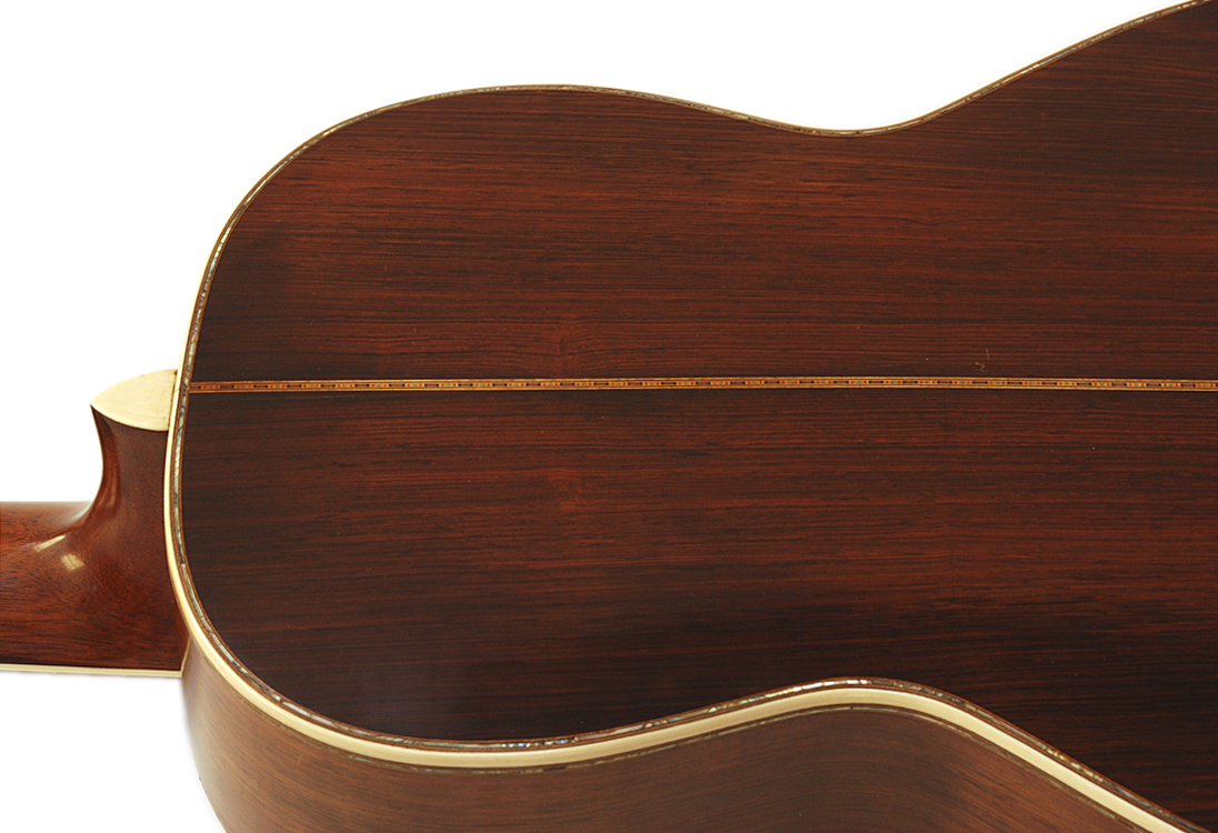 Abalone trim on the perimeter of the top, sides, and back of the guitar