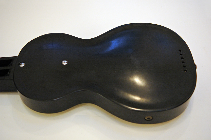 Black Bakelite body, with wooden neck and conventional frets. 1 1/2 inch "horseshoe" magnet pickup.